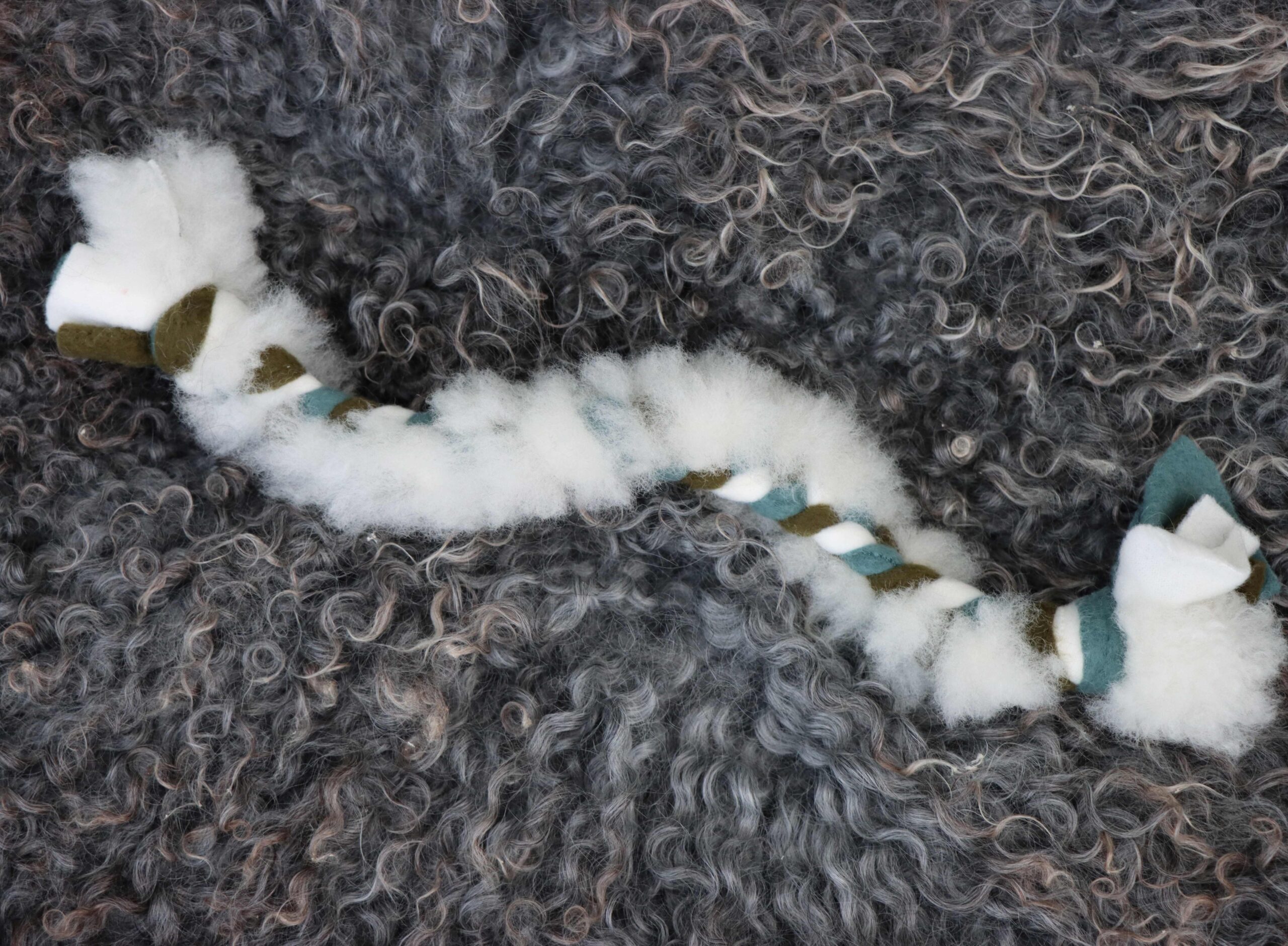 En rolig och funktionell handgjord hundleksak, skapad med omtanke och kärlek. Denna unika hundleksak är tillverkad av högkvalitativ fleece och naturlig ull, sammanflätade för att skapa en robust och mjuk leksak som din hund kommer att älska.