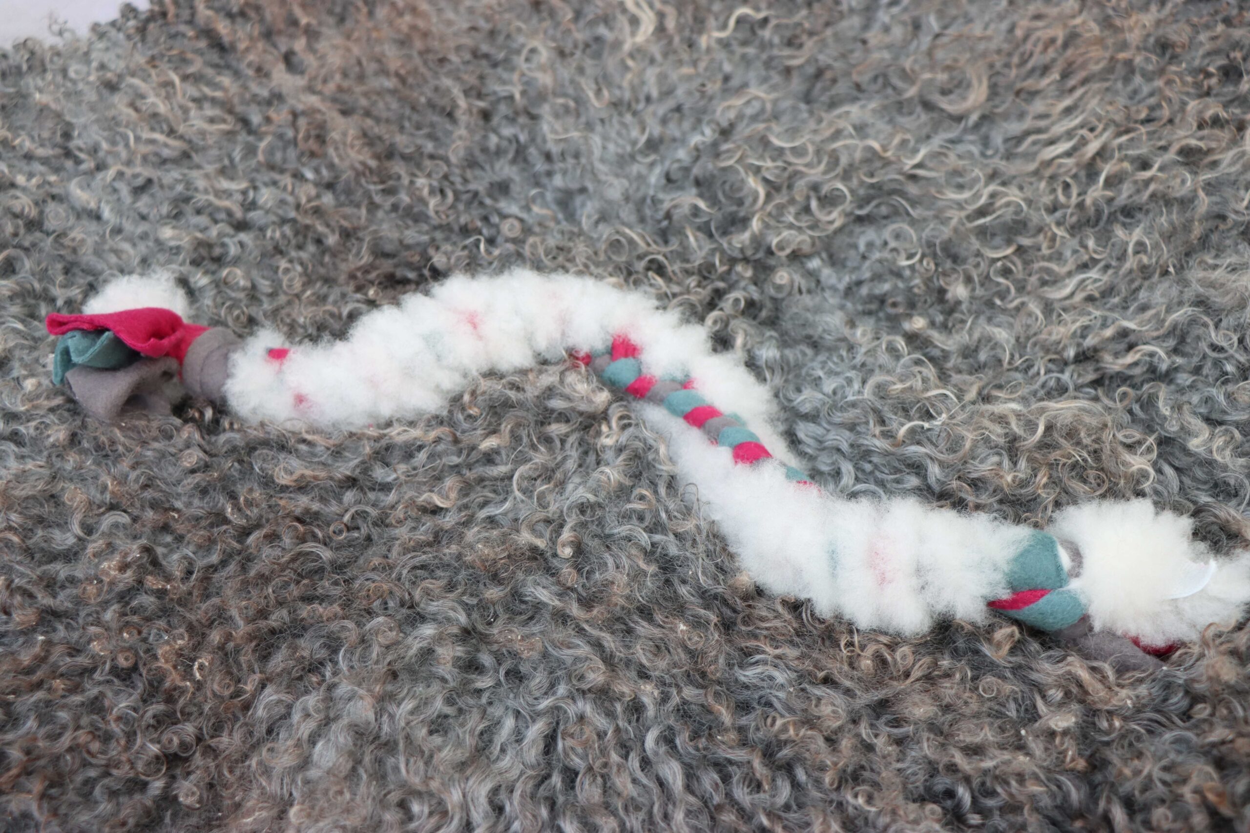 En rolig och funktionell handgjord hundleksak, skapad med omtanke och kärlek. Denna unika hundleksak är tillverkad av högkvalitativ fleece och naturlig ull, sammanflätade för att skapa en robust och mjuk leksak som din hund kommer att älska.
