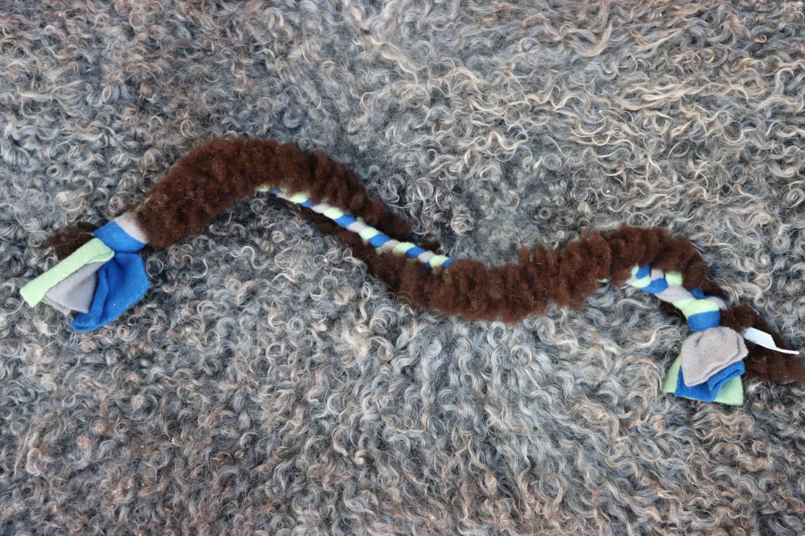 En rolig och funktionell handgjord hundleksak, skapad med omtanke och kärlek. Denna unika hundleksak är tillverkad av högkvalitativ fleece och naturlig ull, sammanflätade för att skapa en robust och mjuk leksak som din hund kommer att älska.